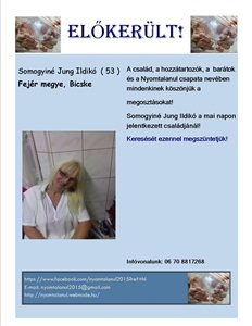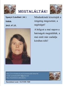Spanyó Lászlóné 2015 július 06.-án siófoki otthonából ismeretlen helyre távozott.
